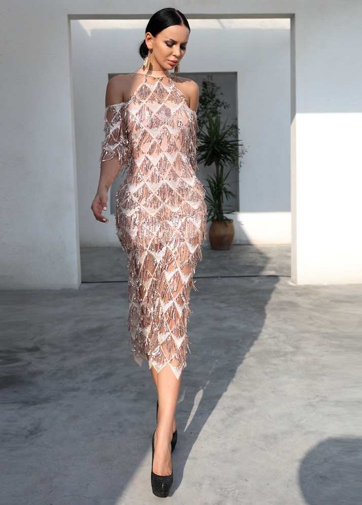 Beige Knee Length Sequin Dress